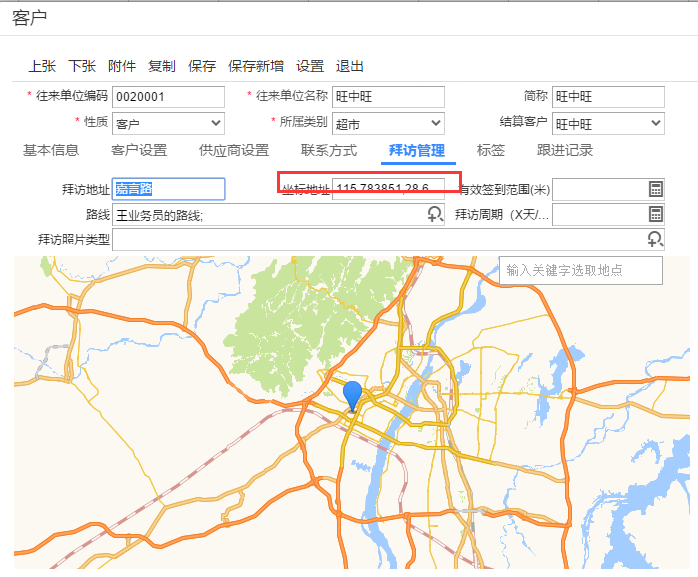 3. 往来单位档案里要勾选拜访管理,并且设置客户地址坐标;