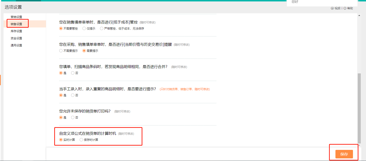 3、点击【系统管理】-【选项设置】-【销售设置】,计算公式选择【实时生效】。
