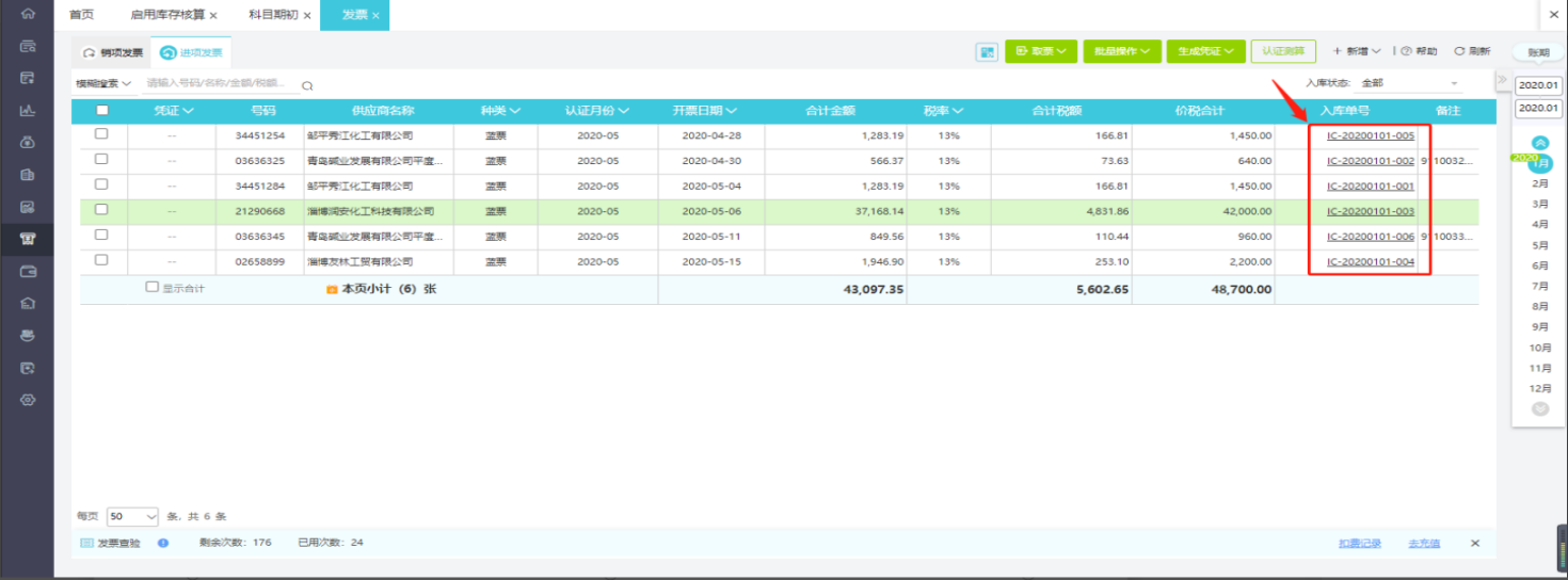 ③维护好发票下【发票管理】中进项、销项发票明细,入库单出库单自动生成发票采集到系统中快速的方式有以下方式: